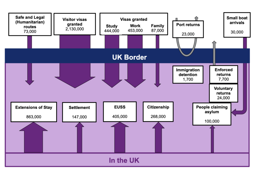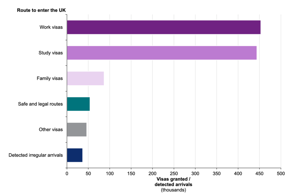 Eylül 2024 sonu itibariyle, Birleşik Krallık’a gelmek veya Birleşik Krallık’ta kalmak için güvenli ve hukuki (insani) yollarla 89.250 kişi için vize verildi. Bu, bir önceki yıla göre %19’luk bir azalma anlamına gelmektedir ve bu düşüş, büyük ölçüde Ukrayna Programları kapsamında verilen vize ve uzatma sayısındaki azalmadan kaynaklanmıştır.