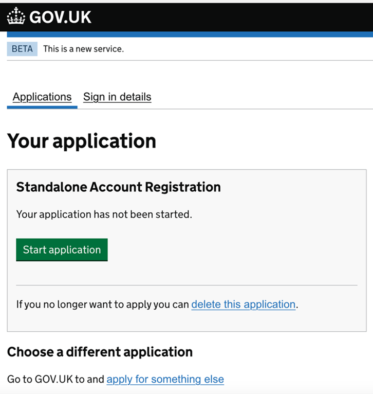 Kimlik doğrulaması için Standalone Account Registration başvurusunun yapmak üzere Start Applicaton ‘a basarak bir sonraki aşamaya geçiyoruz.